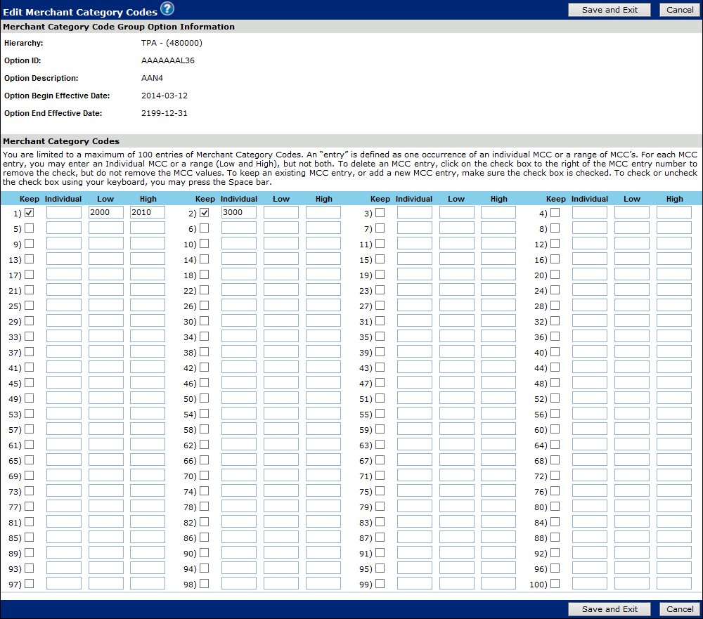 11. Repeat until all codes for the category have been entered and click Save and Exit. The Add Purse Option page re-displays with the associated MCCs listed under the Primary MCCs field.