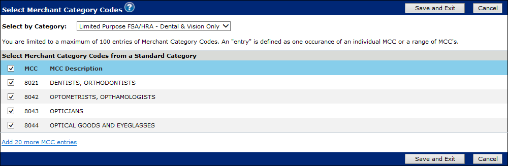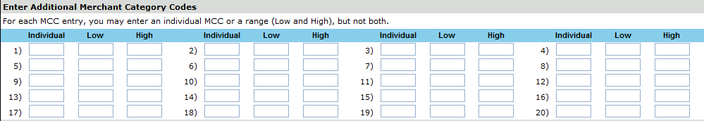 9. If you want to add additional options, click the Add 20 more MCC entries link. The Enter Additional Merchant Category Codes section displays