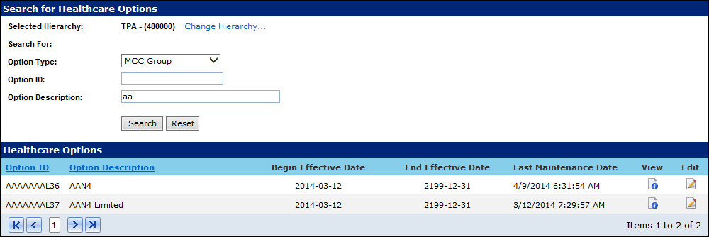 1. Select Options from the menu. The Search for Healthcare Options page displays.